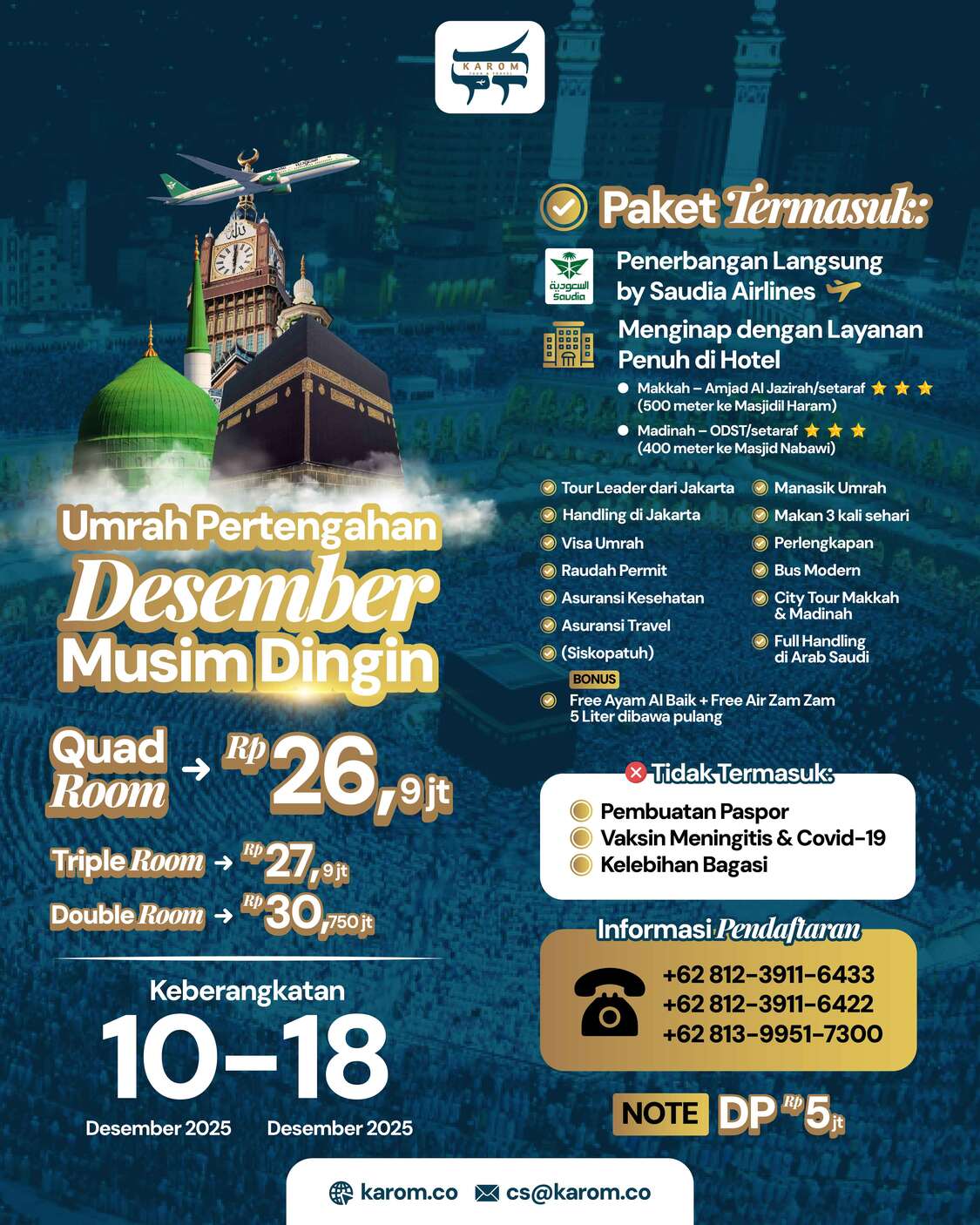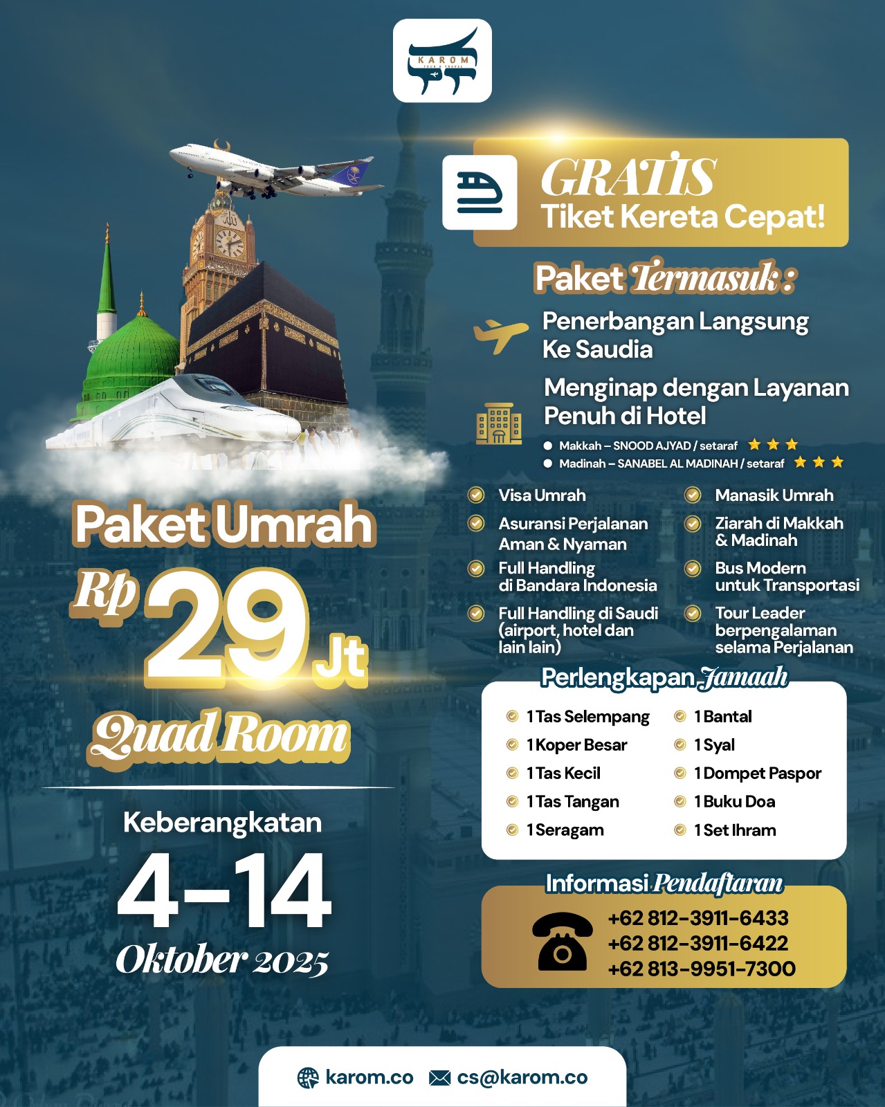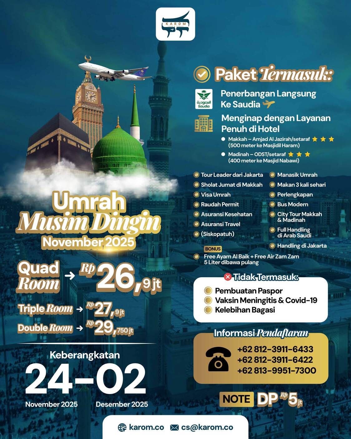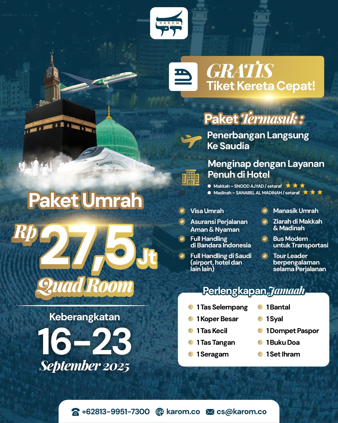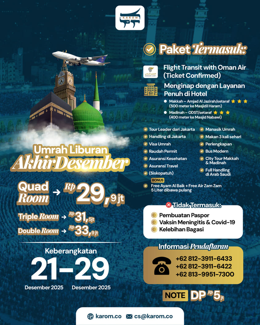 Nikmati pengalaman Umroh yang tenang, nyaman, dan penuh makna. Bersama Karom, setiap langkah Anda menuju Baitullah dipandu dengan amanah, layanan terbaik, dan harga transparan.