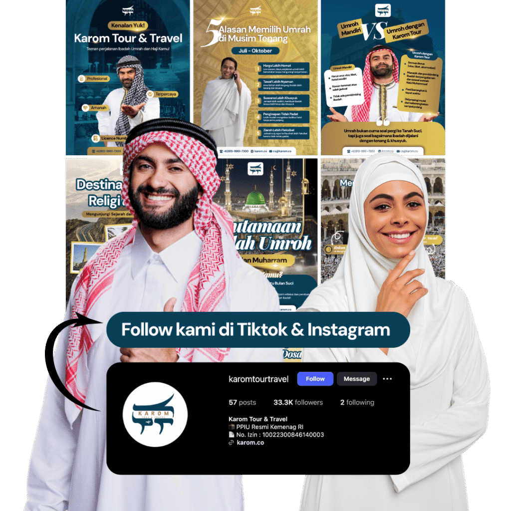 Karom Tour & Travel adalah biro perjalanan resmi yang berkomitmen memberikan pengalaman ibadah Umroh terbaik. Dengan izin resmi Kementerian Agama, Karom telah mendampingi ratusan jamaah berangkat ke Tanah Suci dengan layanan profesional, ramah, dan penuh keikhlasan.